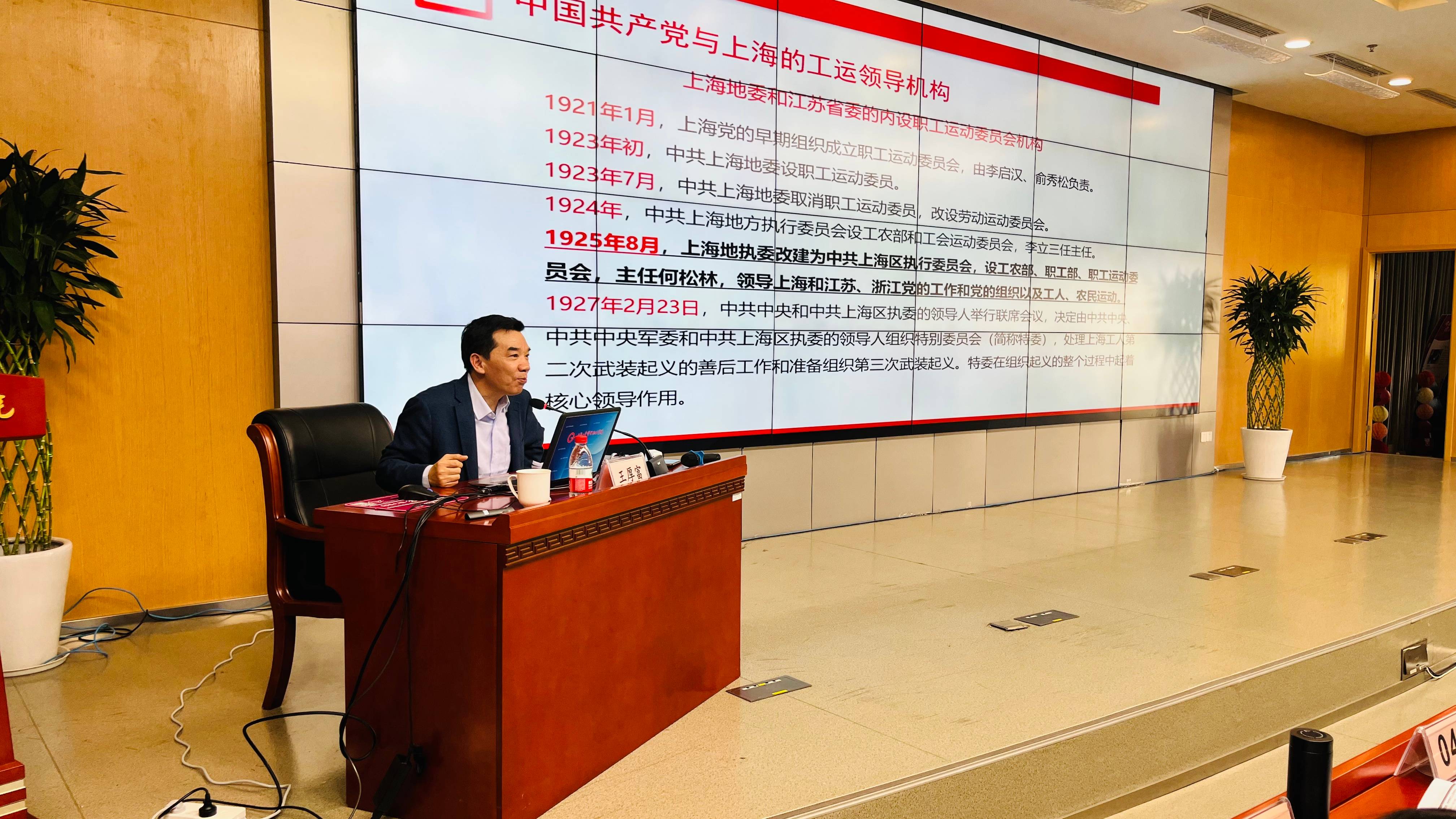 4月8日上午,为贯通党性党风党纪教育,根据庆祝全国总工会成立100周年“永远跟党走,奋进新征程”和上海总工会成立100周年“赓续百年工会荣光,谱写新时代新篇章”主题活动部署安排,学院党委书记王厚富结合新上岗工会主席岗位资格第5期(机关事业)培训班的授课,为全体党员讲授专题党课《上海工会百年奋斗历程与经验启示》。