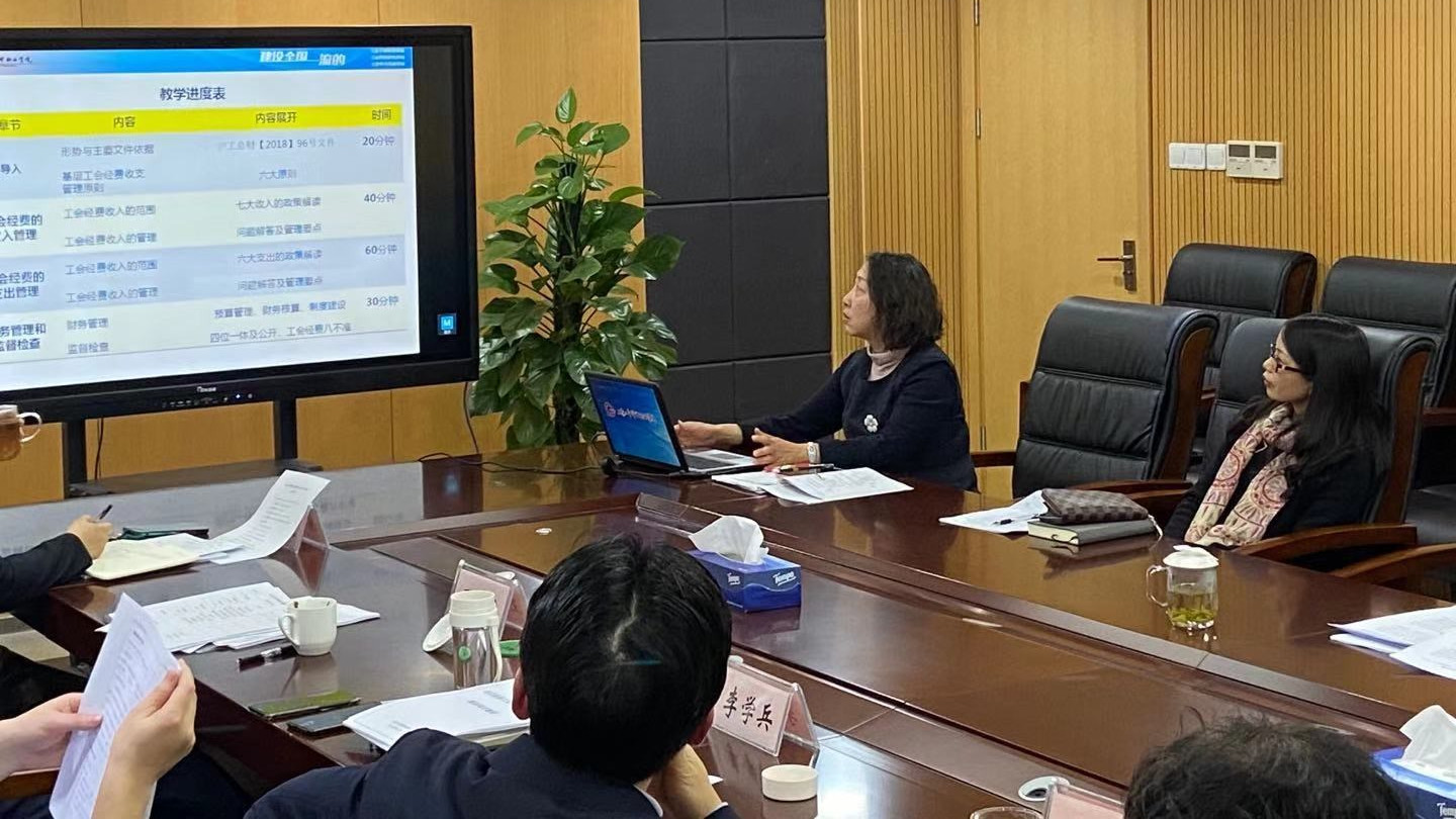 会议第一项议程是对袁雪飞的《工会经审工作》、杨幼芳的《工会经费管理与使用》两门新课进行评审。首先,由老师说课,说课结束后,学术委会成员进行点评,并进行投票表决,同意《工会经审工作》、《工会经费管理与使用》两门新科的开设。