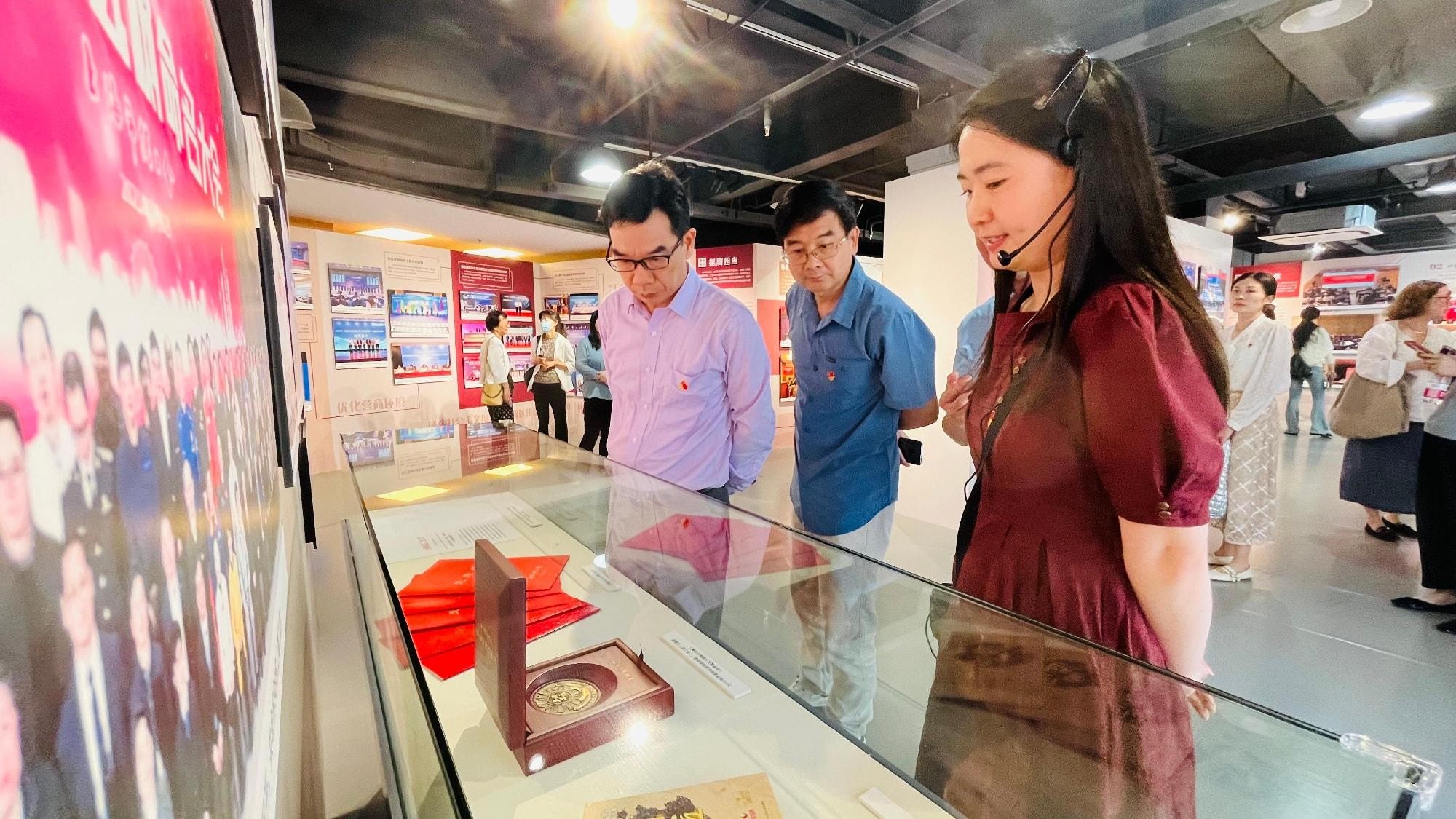 在上海市工人文化宫,学院教师李健、黄丽璇、吕晓彤作为“永远跟党走,奋进新征程,建功新时代”上海工会发展历程展大纲的编撰者,围绕新民主主义革命时期、社会主义革命和建设时期、改革开放和社会主义现代化建设新时期、中国特色社会主义新时代时期的上海工会,结合展陈史料和各自参与展陈大纲编写的感想体会,分别为大家详细讲解了百年上海工人运动、工会事业奋斗历程,使大家感受到了中国特色社会主义发展道路的制度优势和工人阶级的伟大力量。